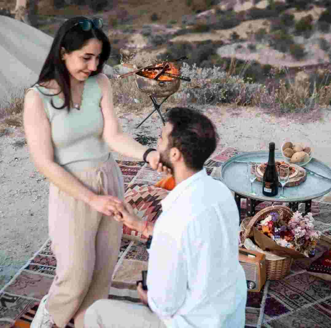 Kapadokya’daki peri bacaları arasında yapılan evlilik teklifi harikaydı. Doğa ve tarihin iç içe geçtiği bu mekânda özel bir an yaşamak bizi çok mutlu etti.